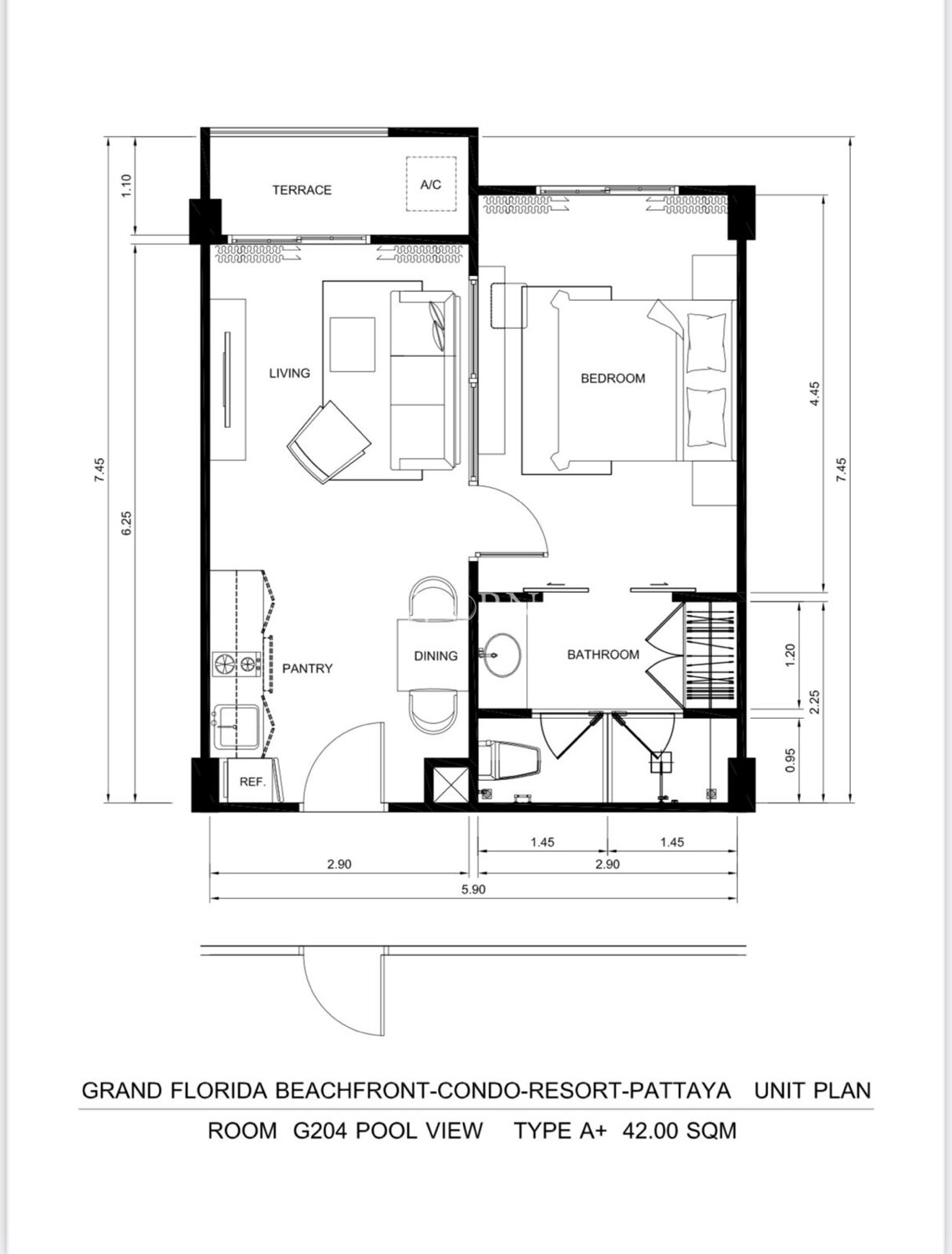 Discover the perfect blend of comfort and style with this fully furnished 1-bedroom apartment in the prestigious Grand Florida Beachfront Condo Resort Pattaya. With 42 square meters of thoughtfully designed space, this inviting flat is situated on the 2nd floor of an 8-story building, offering just the right balance of privacy and convenience.