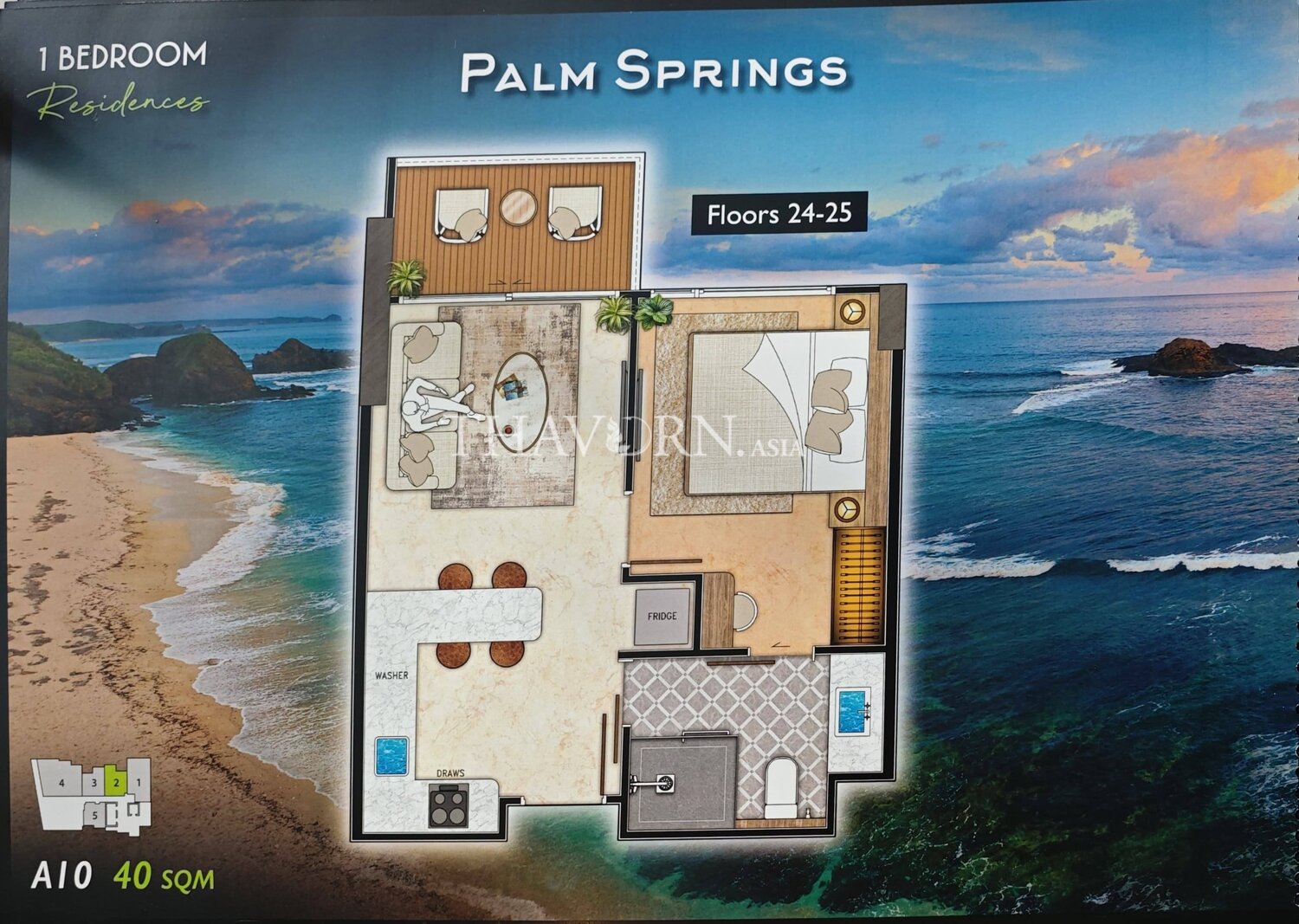 The unit measures 40 m² and sits on the 24th floor of a 33-storey building; it is fully furnished and offered under the foreign quota.