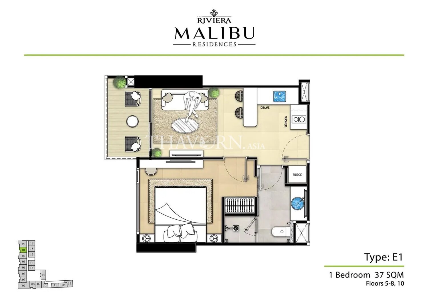 Cozy one-bedroom flat in the new Riviera Malibu & Residences development in Pratumnak, Pattaya, scheduled for completion in 2027. The project presents a fresh opportunity in a sought-after neighborhood.