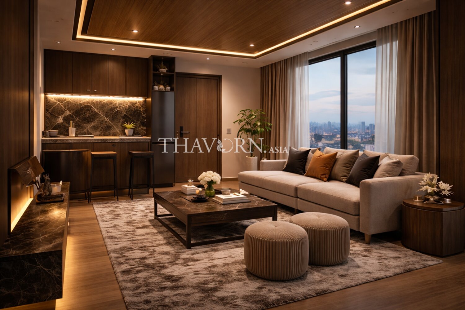 The fully furnished 37 m² unit occupies the 30th floor of a 34-storey building and is offered with foreign quota ownership, a thoughtful layout well suited to singles or couples.