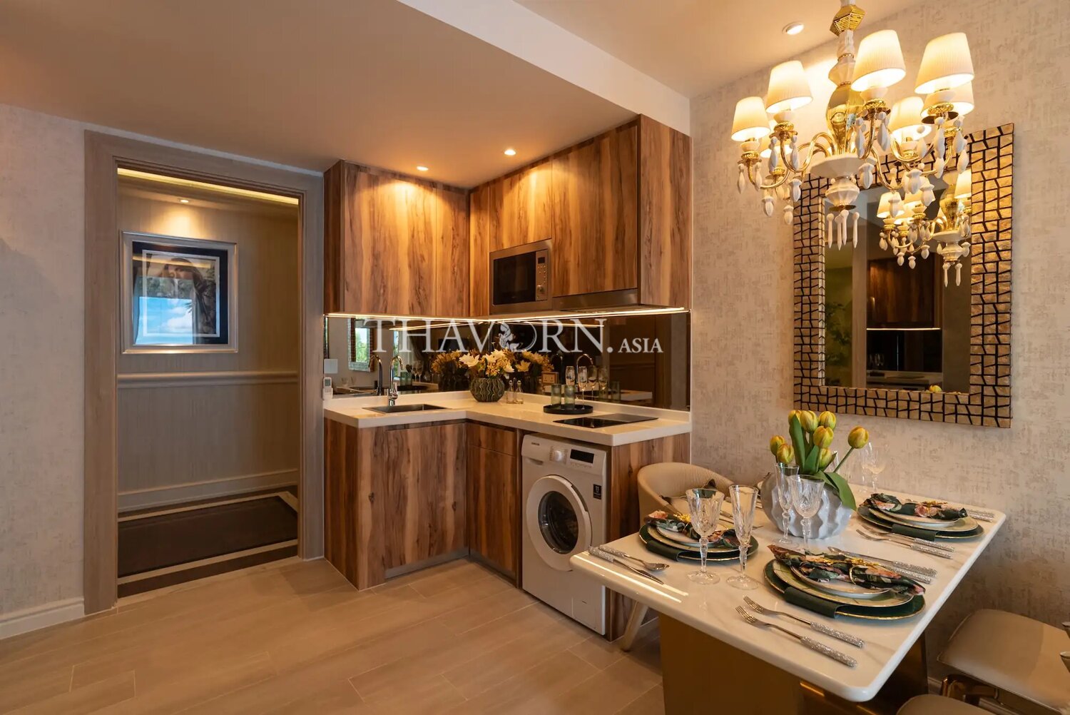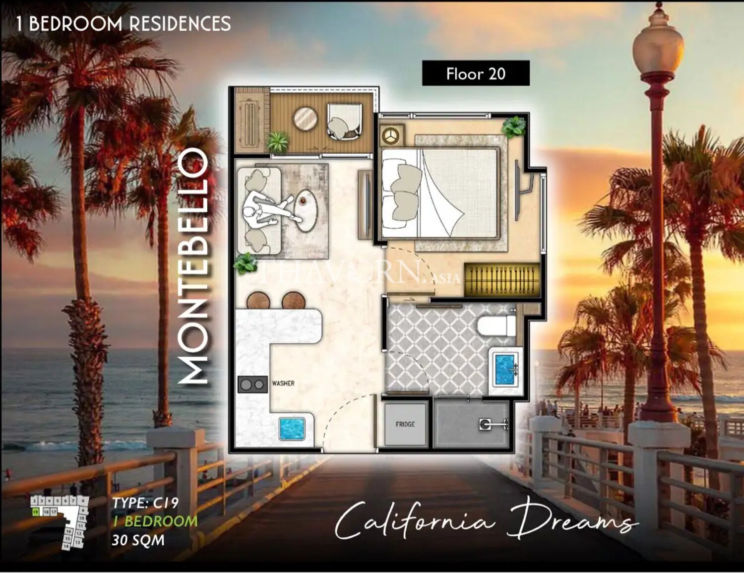 The fully furnished flat measures 30 m² and sits on the 20th floor of a 34-floor building, offering a thoughtful layout with one bedroom. Ownership is available under the foreign quota.