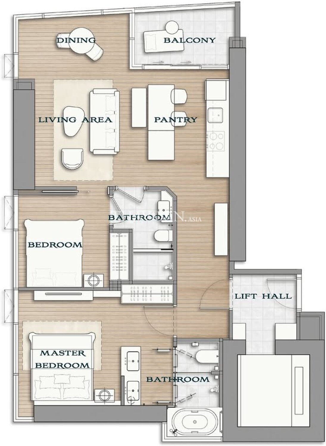 Enticing facilities with direct beachfront access in the front building offer several fun options for residents to have a good time in. Here, you can enjoy fully equipped amenities such as a modern Fitness Center, Yoga Room, Golf VR (simulator), Kid’s Pool, Kid’s Playroom, Onsen, Steam Room and Salon/Spa services.