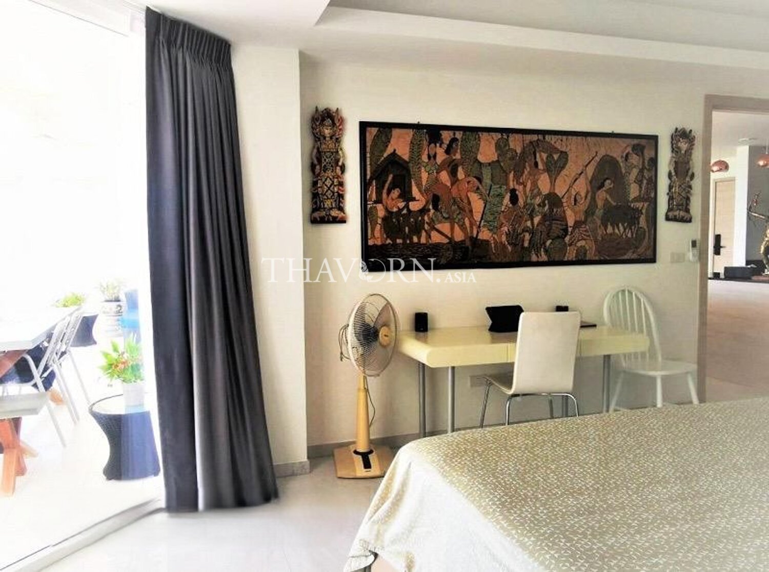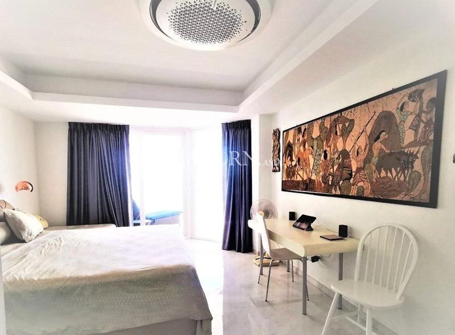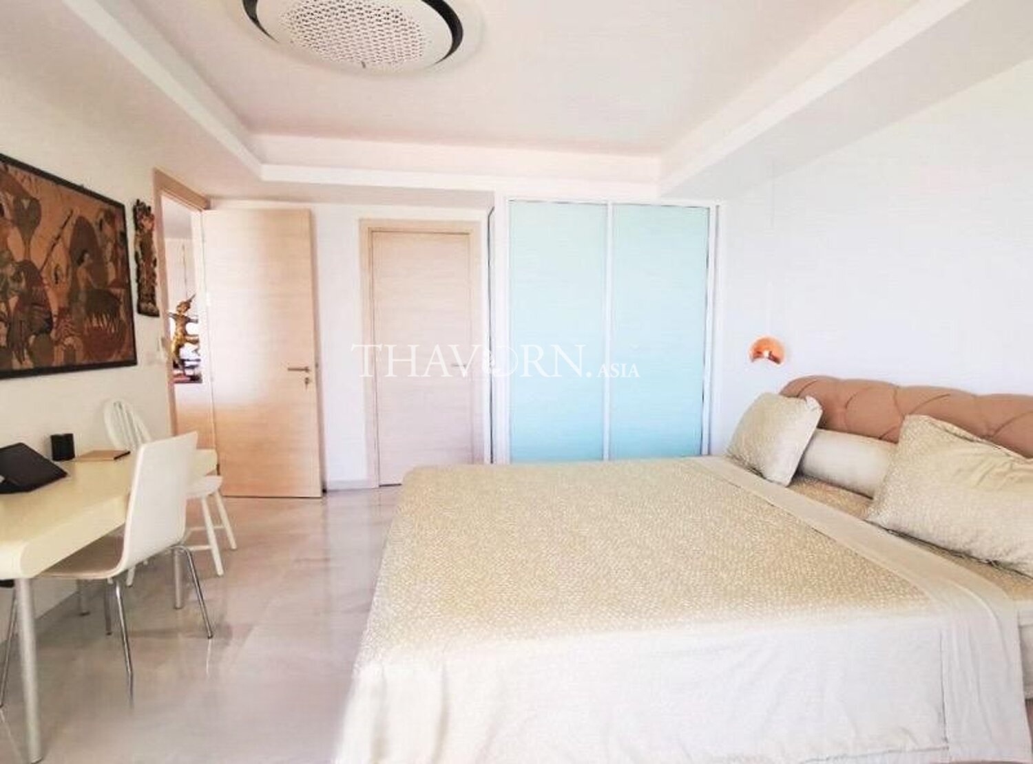ห้องนอนเดียวบนชั้น 9 จากทั้งหมด 18 ชั้น พื้นที่ใช้สอย 94 ตร.ม. ตกแต่งครบพร้อมเฟอร์นิเจอร์ และเป็นกรรมสิทธิ์โควตาต่างชาติ.